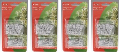 Kerstboom decoratie kerstbalhaakjes zilver 600 stuks. In 1 verpakking zilveren kerstbalhaakjes zitten 150 stuks, verdeeld over 100 stuks van 4 cm en 50 van 6 cm. De haakjes zijn gemaakt van metaal en zijn buigbaar. Kerstboom decoratie accessoire. In totaal ontvangt u 600 kerstbalhaakjes, verdeeld over 4 verpakkingen.