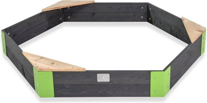De EXIT Aksent houten zandbak is een zandbak in de vorm van een zeshoek. De zandbak heeft drie houten zitjes zodat je tijdens het spelen niet volledig onder het zand komt te zitten en biedt tegelijkertijd genoeg ruimte om heerlijk te ravotten met vriendjes en vriendinnetjes. De Aksent houten zandbakken van EXIT Toys zijn eenvoudig te monteren en super stevig. De voorgeboorde planken worden in de hoeken bevestigd aan metalen koppelstukken, waardoor de zandbak stabiel staat. De hoeken hebben een opvallend groene kleur en dit in combinatie met het grijskleurige hout geeft de zandbakken een moderne uitstraling. De Aksent zandbakken van EXIT Toys zijn gemaakt van FSC® gecertificeerd cederhout (FSC 100%, SCS-COC-000652-WH). Deze houtsoort splintert niet en is van nature bestand tegen weersinvloeden zoals regen en dus resistent tegen houtrot. Je hoeft EXIT houten zandbakken voor gebruik niet te behandelen, kinderen kunnen er direct veilig mee spelen.