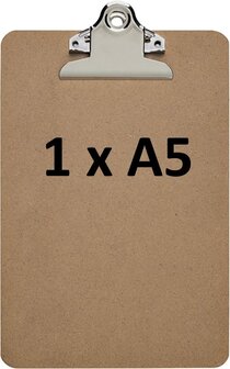 - Stable design clipboard made of hard fibre with nostalgic clip\n- Also ideally suited for menus, display windows or reception areas\n- Solid retro inspired steel clip with strong steel spring\n- Comfortable: paper stop at the top\n- Trendy design for price-conscious customers\n- Untreated board surface for natural look\n- Convenient: can be hung up\n- Gentle: rounded edges\n- Clip opening approx. 1,5 cm (A5) and 2,5 cm (A4 and A3)\n- Board thickness 0,3 cm\n- Can be recycled