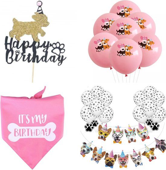 22-delige honden verjaardag set Happy Birthday roze met taarttopper, ballonnen, slinger en bandana