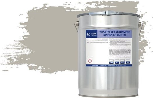 Wixx PU 250 Betonverf is een professionele kwaliteit één component polyurethaan betonverf, deze kan Binnen & Buiten toegepast worden. Zeer slijtvaste coating voor het stofvrij maken van stuivende en stoffige beton- of cementdekvloeren. Dit product is niet bestand tegen weekmakers van autobanden, hiervoor adviseren wij de Wixx 2K 650 Extreme Betoncoating.