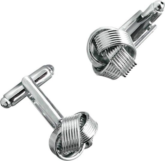Een paar ronde zilverkleurige manchetknopen met het ontwerp van een fijne gevlochten knoop. Een fantastisch accessoire voor zakelijke en casual outfits.