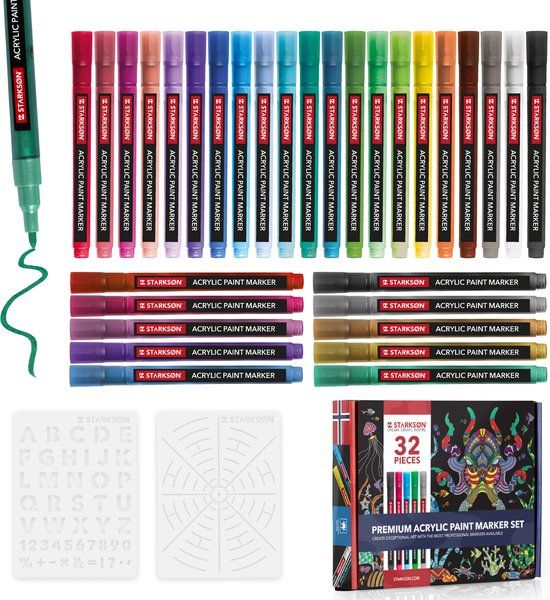 STARKSØN 30-delige Acrylstiften Set - 0.7mm - Schilderen op Stenen, Glas & Mandala's - Incl. Sjablonen - Markers