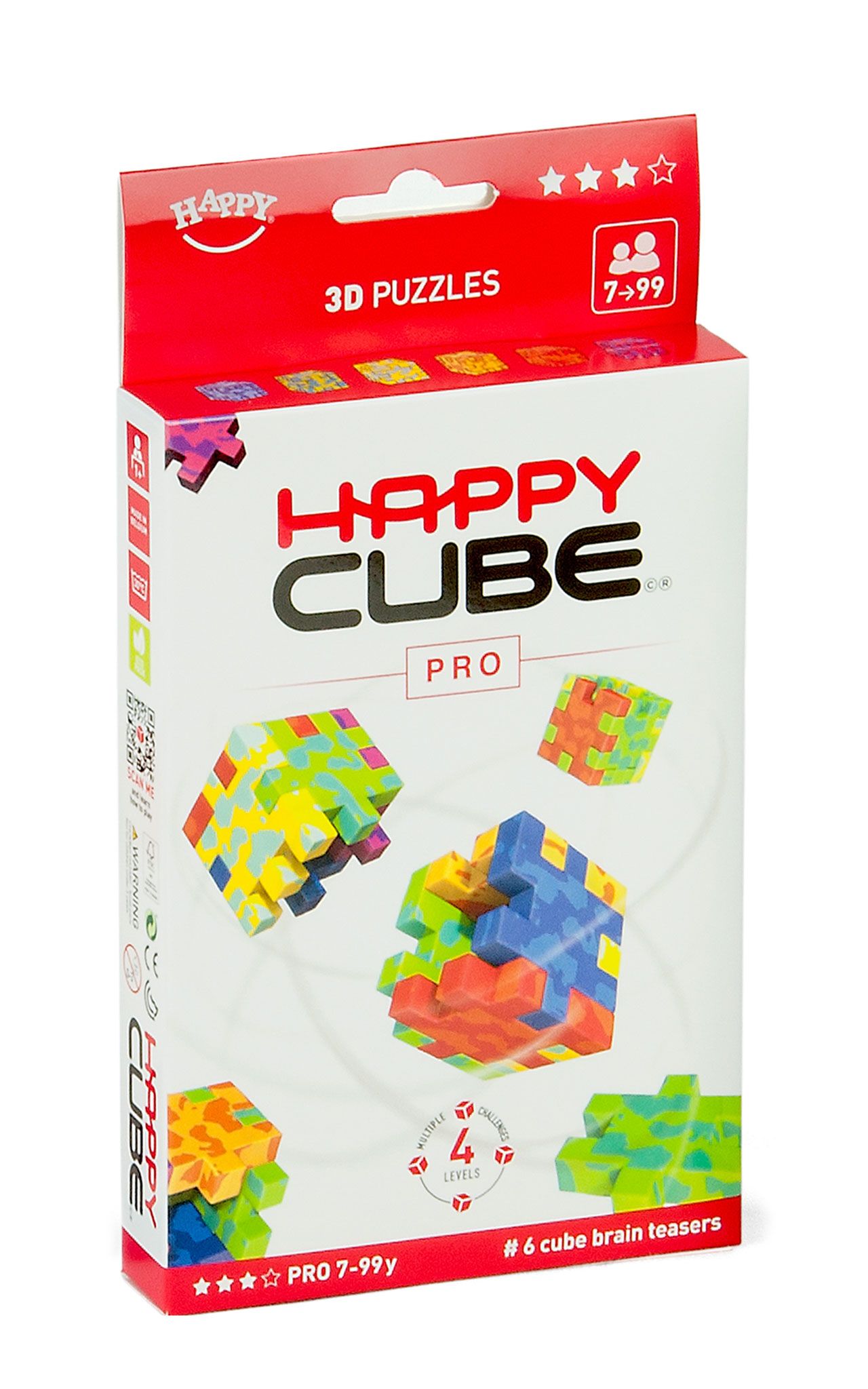 Happy Cube© Pro herken je zo aan zijn felle kleuren en is zeker niet voor beginners! Deze puzzels zijn voor echte puzzelprofs. De uitdaging is groot want elke puzzel heeft maar één oplossing. Elk model heeft zijn eigen vorm, kleur en naam, die verwijst naar een bekende wereldburger. De oranje puzzel, alias Rubens, verwijst bijvoorbeeld naar de beroemde schilder.