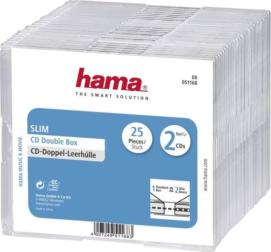 -Super slim case to hold two CDs each.\n-2 of these empty cases can be stored in one standard CD insert pocket due to small height (5.2 mm).\n-Ideal replacement when the original box is damaged or as storage of security backups.\n-75% space-saving.\n-25 pcs./pack, welded.\n-Colour: transparent.\n\n- Super slim jewel case for two CDs\n- Due to their low height (approx. 5.2 mm), two of these jewel cases fit in a standard CD compartment\n- Space saving: 75%\n- Ideal replacement for damaged original cases as well as for storing all kinds of back-up copies