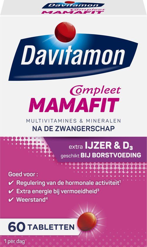 - Samenstelling:# Davitamon Compleet Mamafit bevat per dagdosering van 1 tablet:# Vitamines;RI*# A;400;µg;50%# B1;1,65;mg;150%# B2;2,1;mg;150%# B3;24;mg;150%# B5;6;mg;100%# B6;2,1;mg;150%# B8;100;µg;200%# B11 (foliumzuur);400;µg;200%**# B12;5;µg;200%# C;32;mg;40%# D3 (cholecalciferol);10;µg;200%**# E;6;mg;50%#Mineralen;RI*#calcium;120;mg;15%#chroom;20;µg;50%#jodium;75;µg;50%#koper;0,5;mg;50%#magnesium;56,25;mg;15%#mangaan;1;mg;50%#molybdeen;25;µg;50%#selenium;27,5;µg;50%#ijzer;21;mg;150%#zink;5;mg;50%# *RI=Referentie Inname volgens de Gezondheidsraad.# **Specifiek aangepaste dosering voor vrouwen met een kinderwens, zwangere vrouwen en vrouwen die borstvoeding geven, conform advies Gezondheidsraad.