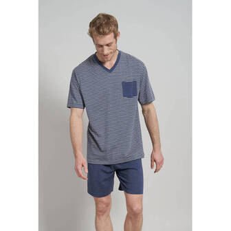 Heren shortama van het merk Ceceba. De top heeft kapmouwtjes en een V-hals en is gestreept. De korte broek is voorzien van een elastische tailleband. De set is gemaakt van is gemaakt van katoen.