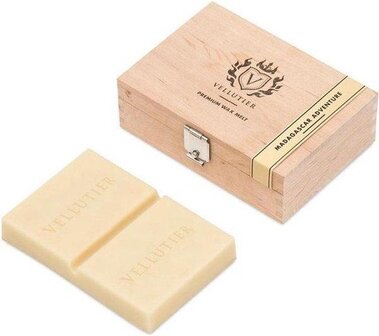 Vellutier 'Madagascar Adventure' wax melt: De wax zit in een mooie houten boxje, waardoor het ook uitermate geschikt is om cadeau te geven. Het geheel ziet er uit als een luxe geschenk. Bij een juist gebruik gaat de wax minimaal 16 uur mee.