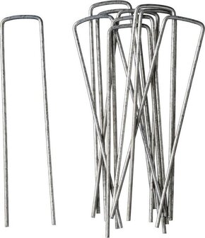 Houdt het gronddoek/onkruiddoek/worteldoek op zijn plaats met deze metalen pennen. De stevige verankering in de grond zorgt ervoor dat uw gronddoek niet wegwaait. U ontvangt 3 pakjes met 10 stuks. Afmeting: ca. 14 x 3 cm. Materiaal: metaal. Kleur: grijs. Tuin/tuinier benodigdheden gronddoek/worteldoek/anti-onkruiddoek vasthoud/bevestiging pennen.