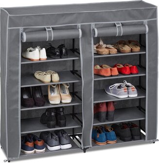 Je kan al je schoenen in deze grote schoenenkast opbergen. De 12 vakken bieden ruimte voor 36 paar schoenen die dankzij de stoffen hoes met ritssluiting beschermd zijn tegen stof. Hierdoor kan je het stoffen schoenenrek ook voor langere tijd in de kelder of op zolder laten staan. Maar ook in de hal of in het trappenhuis komt de schoenenopberger goed van pas. De vakken en de hoes van vlies kun je met een vochtig doekje afdoen als het nodig is.