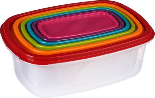 Deze vershoudbakjes zijn verkrijgbaar in vier diverse sets. Alle bewaarbakjes voor eten hebben een deksel waarmee je de bakjes luchtdicht kan afsluiten. De vershoudbakjes set is gemaakt van polypropyleen kunststof en is BPA-vrij dus veilig voor het opbergen van voedsel. De bakjes zijn van klein naar groot nestbaar in elkaar waardoor je ze ruimtebesparend kan opbergen. De voedsel opbergdozen kunnen in de diepvries en de magnetron maar zijn niet oven- en vaatwasserbestendig. Afmetingen vershoudbakjes 'rechthoekig 6 formaten'Roze: 14,5 cm breed, 7,5 cm diep en 4 cm hoog. (inhoud 0.3 liter)Paars: 16 cm breed, 9,3 cm diep en 5 cm hoog. (inhoud 0.5 liter)Blauw: 18m breed, 11 cm diep en 5,4 cm hoog. (inhoud 0.7 liter)Groen: 20 cm breed, 13,5 cm diep en 6,5 cm hoog. (inhoud 1.15 liter)Oranje: 22,7 cm breed, 16 cm diep en 8 cm hoog (1.8 liter)Rood: 25,5 cm breed, 20 cm diep en 9 cm hoog (2.8 liter)Afmetingen vershoudbakjes 'vierkant 7 formaten'Roze: 7,4 cm breed, 7,4 cm diep en 4 cm hoog. (0.1 liter)Paars: 9 cm breed, 9 cm diep en 5 cm hoog. (inhoud 0.2 liter)Blauw: 10,7 cm breed, 10,7 cm diep en 5,7 cm hoog. (inhoud 0.4 liter)Groen: 13 cm breed, 13 cm diep en 6,7 cm hoog. (inhoud 0.65 liter)Oranje: 15,5 cm breed, 15,5 cm diep en 7,5 cm hoog. (inhoud 1.1 liter)Rood: 18,5 cm breed, 18,5 cm diep en 9,5 cm hoog (inhoud 1.9 liter)Grijs: 22 cm breed, 22 cm diep en 10,5 cm hoog (inhoud 3.2 liter) Vershoudbakjes set van Five® Met vershoudbakjes kun je van alles. Restjes eten van de avond daarvoor opbergen, je lunch erin meenemen of het gebruiken als bakjes voor opwarmen. Daarom is het handig om altijd een vershoudbakjes set in huis te hebben. Deze voedsel opbergdozen van Five®