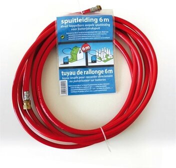 Direct koppelbare soepele spuitleiding voor batterijdrukspuit. Behandel tot 200 m² terwijl de batterijdrukspuit blijft staan. Ideaal voor: behandelen van daken en muren (als men op een ladder staat bv.) op moeilijk bereikbare plaatsen (tussen rozen, hees
