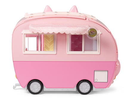 Kampeer in perrrrfecte stjil met de Na Na Na Surprise Kittencamper! De Na Na Na Surprise zachte modepoppen kunnen nu een roadtrip maken met hun eigen gezellige camper met kittenthema! De echt rollende camper is stijlvol, comfortabel en kan transformeren in een kampeerplaats-speelset. Klap de bovenkant, voorkant en het zijpaneel open om 7 speelgebieden te onthullen met heel verrassingen zoals een keuken met magnetron en fornuis, hangmat, bed, kruk, tafel, douche, kledingrek en meer. Inclusief echt werkende wielen, ramen en laden en allerlei zachte voorwerpen en accessoires met dierenthema. De camper is geschikt voor Na Na Na Surprise-poppen van alle afmetingen en kan gekoppeld worden aan de Na Na Na Surprise zachte pluchen cabrio!