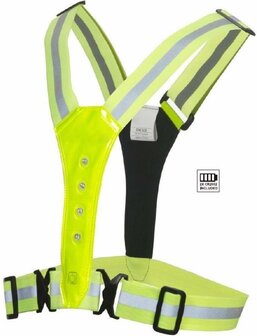 Niets is belangrijker dan het waarborgen van uw en andermans veiligheid tijdens het sporten zoals bij het wandelen, fietsen of hardlopen, met dit led vest bent u (ook op lange afstand) goed zichtbaar voor anderen, door de reflecterende kleuren en led lampjes. Het x-vormige vest is felgeel en voorzien van reflecterende banen. Aan de voorzijde vind je bovendien 4 witte ledlampen en aan de achterzijde 4 rode ledlampen, hiermee voorkomt u ongewenste en gevaarlijke situaties. Daarnaast is vest waterbestendig.