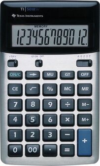 TI-5018 SV\nFraaie bureaurekenmachine voor thuis of op kantoor met een SuperView™-display.\n\nProductkenmerken\n- Goed afleesbaar 12-cijferig SuperView-display\n- Ruim toetsenbord met omrande toetsen voor makkelijke bediening\n- Eenvoudige correcties invoeren met de backspace-toets\n- %-toets om belastingen en kortingen te berekenen\n- Keuzemogelijkheid decimalen en afrondingen\n- Werkt op zonnecellen en batterijen, overal optimaal te gebruiken