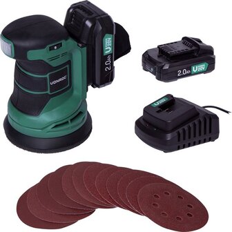 VONROC Accu schuurmachine - VPower 20V - Incl. 2x 2.0Ah accu & oplader - Ø125mm - Met stofzak & 12 stuks schuurpapier
