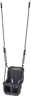 Het KBT baby schommelzitje heeft een T-stuk en een veiligheidsriempje voor de veiligheid van je kindje. De aanbevolen leeftijd voor het gebruik van dit babyschommelzitje is vanaf +/- 9 maanden tot +/- 36 maanden. Het zitje is gemaakt van kunststof (spuitgegoten PP) in de kleur antraciet, de touwen van de schommel zijn zwart. De ringen en stel achten zijn gemaakt van gegalvaniseerd staal en de touwverbindingen zijn van gelast kunststof. Het zitje is geschikt om op te hangen aan schommelframes met een hoogte van 200 tot 240 cm.