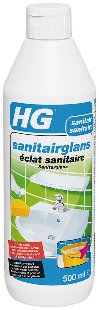 "HG sanitairglans laat wastafels, badkuipen, toiletpotten, kranen en tegels weer als nieuw glanzen. HG sanitairglans ruikt fris en verwijdert badolieranden, zeepresten, huidvetten en lichte kalkaanslag. Door de hoge concentratie zijn een paar druppels op een spons al voldoende. HG sanitairglans bevat geen schuurmiddelen of agressieve bestanddelen en is daarom veilig voor glazuur, chroom, email, kunststof of geverfde oppervlakken. HG sanitairglans streept niet en voorkomt bij regelmatig gebruik kalkaanslag. Doe een paar druppels HG sanitairglans op een vochtige spons en maak de ondergrond goed schoon. Daarna naspoelen of met een vochtige doek afnemen. Spuit bij badkuipen een dunne sliert HG sanitairglans langs de rand en maak de badkuip vervolgens schoon met een vochtige spons.