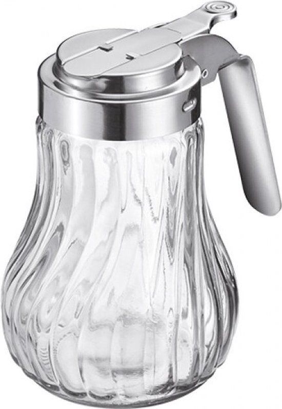 Kunststof/glas, hygiënisch afsluitbaar, geschikt voor melk, room, honing of stroop