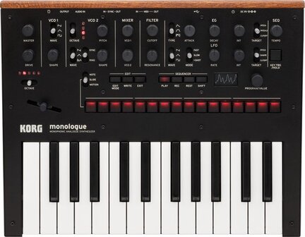 Beautiful and Powerful. Your own monologue! \n\nNext-generation monophonic analog synthesizer in a vivid five-color lineup.\n\nFully programmable, analog synthesis for all players; monologue is the next-generation monophonic synthesizer that shares the spirit of the acclaimed minilogue, with a completely new voice and powerful new features.\n\nThe monologue is a 25-key, fully programmable monophonic analog synthesizer with a voice all its own. While sharing its sleek layout, knob-per-function workflow and high-quality construction with the best-selling minilogue, monologue is a truly unique new synth for all types of musicians; featuring new voicing and sound sculpting abilities – at an amazing price. The monologue's completely new filter, modulation, drive, and LFO can generate powerful basses and sharp leads, creating awesome mono sounds that showcase its single-voice design. The step sequencer has also been dramatically expanded, allowing more intuitive and more complex editing. With a lineup that gives you a choice of five eye-catching colors, this compact instrument has a strong personality to match your own.\n\nRedesigned monophonic analog circuitry.\n\nThe monologue contains monophonic analog synthesizer circuitry that builds on the circuitry of the minilogue. But that doesn’t mean that the monologue is simply a one-voice model of the minilogue. It’s a monophonic beast with stunning power that comes from a redesigned envelope section, modulation routing, and a filter with powerful low-end punch.\n\nThe structure is 2VCO, 1VCF, 1EG, 1VCA, and 1LFO. In addition to the same distinctive circuits as on the minilogue (such as the wave shaping that shapes the overtones of the oscillator, and a sync/ring switch), the filter section uses a two-pole filter to deliver aggressive sound. Newly featured is a drive circuit that adds overtones and distortion to the sound, letting you generate fat basses and sharp lead sounds to your heart's content. The LFO rate can be adjusted into an unprecedentedly ultra-high-speed range to generate crazy space-shattering sounds, or switched to one-shot mode to act, in a sense, as an additional envelope.\n\nThe keyboard section features the acclaimed slim keybed of the minilogue and the MS-20 mini. To make monologue a synth that any musician can immediately pick up and play, the keyboard covers the E–E range of notes - just like a guitar or bass.\n\nFully programmable.\n\nThe monologue goes beyond analog synths in its price range by adding 100 preset locations. Select a program for instant access to great sounds - - ranging from thick basses to deep subs to brilliant cutting leads and even percussive sequences. No need to have deep synthesis knowledge; just choose a sound and tweak - a workflow that is very familiar with musicians today. Built-in programs provide 80 preset sounds and sequences made by creative artists around the world including legendary electronic artist Aphex Twin, plus 20 user locations for saving custom sounds.\n\nIn addition, the Sound Librarian lets you manage your program data.\n\n16-step sequencer for highly-evolved motion sequences.\n\nThe step sequencer of the monologue has been significantly enhanced to deliver musical, complex rhythms that are easy to capture, see, and edit. It supports both real-time recording with overdubbing capability as well as step recording that lets you record simply by pressing keys in the desired order, and you can also use the 16 physical buttons for quick editing or for improvisatory performance. The motion sequence function lets you record up to four knob movements to apply time-varying change to the sound, and allows you to record not only continuously changing values as on previous models, but also values with step-wise variation. Since it's designed to let you create different sounds at each step, you can make unprecedented sequences, such as a sequence that generates a drum pattern from a single program.\n\nThere's also a key trigger function that lets you play back a sequence while you hold down a key, and even transpose it. Another new function is slide, which can be used to produce smooth bass lines by specifying portamento for each step.\n\nMicrotuning lets you freely create scales.\n\nMusic has long been restrained to equal-temperament scales, and today, very few machines support microtuning. The monologue has a set of factory tunings and well as 12 user slots and is compatible with MIDI Tuning Standard 3Byte messages.\n\nThe power of microtonal music is evident in the work of Aphex Twin, who has come onboard as advisor for the implementation and also to offer scales, sounds and sequences as part of the factory presets. All players are encouraged not just to use these Aphex Twin-created scales, but also to create their own scales and explore their own world of frequencies.\n\nOscilloscope visualizes the sound and sequence.\n\nThe OLED display will show the waveform in real time as you sculpt your sound. Visual feedback is both educational and entertaining, and represents a first on a hardware synthesizer. The monologue offers motion view that visualizes the value levels for the motion-sequenced parameters. “See” your motion sequence as it happens.\n\nBattery-powered analog.\n\nFrom smooth curves to muscular straight lines. The stylish visuals featuring aluminum and wood are inherited directly from the minilogue, but have been modified to a straight, direct design that bespeaks the power of a monophonic instrument. In spite of its stout construction, the compact and light-weight body is only 1.7 kg / 3.78 lbs., providing an unprecedented combination of toughness and portability.\n\nIn addition, unlike most analog synthesizers in its class, the monologue can operate on batteries. Even if you're a hardware performer who uses numerous units, you won't need to worry about providing additional power supplies and installation space.\n\nSync with Audio Sync.\n\nIn addition to 5-pin In/Out 