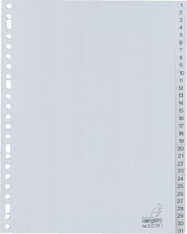 Tabbladen grijs PP 120 mµ. De tabs zijn éénzijdig zwart bedrukt met cijfers. Per set verpakt in een krimp. A4 23-rings.