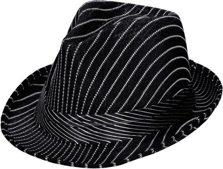 Zwarte trilby hoed met krijtstreep voor volwassenen. De maffia stijl gangsterhoed is zwart met witte krijtstrepen. Hoofdmaat: one size, ongeveer maat 57-58. Materiaal: 95% polyester/ 5% wol. Verkleedkleding accessoires hoeden.