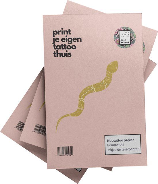 Ons papier heeft het standaard A4-formaat en is ontworpen voor zowel Inkjet- als laserprinters. De set voor volwassenen bevat niet alleen 3 vellen neptattoo papier, maar ook 3 vellen overdrachtsfolie, samen verpakt met een duidelijke instructiekaart. Het proces is eenvoudig: druk je gewenste ontwerpen af op het neptattoo papier met behulp van je printer. Daarna pak je de overdrachtsfolie erbij. De overdrachtsfolie is een plastic folie die je na het printen over het neptattoo papier plakt. De folie zorgt ervoor dat de inkt van het papier wordt overgebracht op de huid. En voila, jouw eigen plaktattoo is gemaakt!
