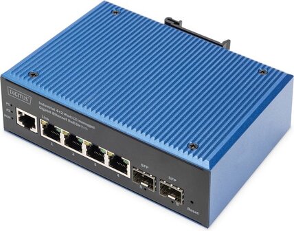 Digitus DN-651155. Switch type: Managed, Switch-laag: L2. Type basis-switching RJ-45 Ethernet-poorten: Gigabit Ethernet (10/100/1000), Aantal basis-switching RJ-45 Ethernet-poorten: 4, Aantal geïnstalleerde SFP modules: 2. Full duplex. MAC-adrestabel: 4000 entries, Switchingcapaciteit: 1 Gbit/s. Netwerkstandaard: IEEE 802.3af. DC voltage input: 48 - 57 V. Power over Ethernet (PoE)
