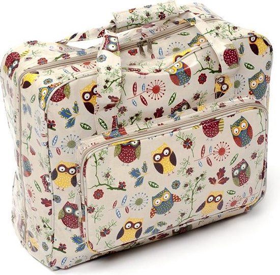 Naaimachinetas'Owl' van Hobbygift. Ben jij ook zo dol op je naaimachine en wil je hem overal mee naar toe kunnen nemen? Deze prachtige naaimachine tas van vinyl is onze favoriet om je naaimachine in te bewaren en mee te nemen. De tas heeft een mooie print met uiltjesrint en heeft een stevige voering zodat je naaimachine goed beschermd is. Het grote vak met dubbele rits is tot op de bodem te openen zodat je naaimachine gemakkelijk in de tas schuift en de voorkant van de tas heeft een extra vak met rits om spulletjes zoals fournituren en patronen in te bewaren. Bovendien heeft de tas heeft een stevige bodem met zwarte plastic pootjes zodat hij goed blijft staan en een handig hengsel om de tas gemakkelijk mee te nemen. Twijfel niet langer en bestel nu!