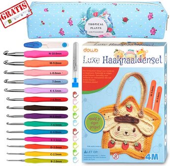 U krijgt 14 Ergonomische Haaknaalden, 9 Garennaalden, 10 Steekmarkeerders, 1 Schaar & Etui. Fantastische waarde voor je geld. Steekmarkeerders, scharen en garennaalden zijn een geweldige bonus in een handig etui. De haaknaaldenset is een geweldige startersset.