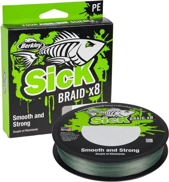 De Sick Braid Moss Green lijn is een gevlochten lijn van Berkley die geweven is uit 8 dunnere strengen en wordt dan ook een 8-carrier genoemd. De lijn heeft hierdoor geen rek wat resulteert dat je iedere aanbeet direct zult voelen in je hengel. Dit maakt de lijn uitermate geschikt voor de roofvisserij. Doordat de lijn is afgewerkt met een microcoating van polymeer, is de lijn erg zacht waardoor je er ook nog eens verder mee zult werpen. De lijn is erg sterk in zowel trekkracht maar ook op de knoop waardoor je er flink wat kracht op kunt zetten en het drillen van kapitale vis ook geen probleem is. Deze mos-groene variant is het minst zichtbaar van alle uitvoeringen en valt mooi weg in de natuur. Ideaal voor het vissen op gevoelig water en tussen de planten.