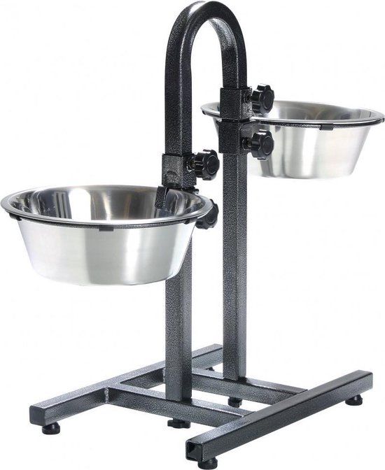 Dit is een ideale voerstandaard voor mensen die graag zelf de hoogte van de voer- en drinkbakken van hun dieren instellen. Deze H-vormige standaard is vernist en heeft aan beide zeiden een voer- en drinkbak bevestigd. Je kunt de hoogte van de bakken bepalen door de standaard te verstellen, door de handige draaiknoppen boven en onder in te stellen zoals jij ze wilt hebben. Om het nog makkelijker te maken, kun je de bakken los van elkaar verschuiven, zodat de hoogte verschillend kan zijn. Door deze hoogte goed op jouw dier af te stemmen, help je jouw hond zijn eten beter te verteren.