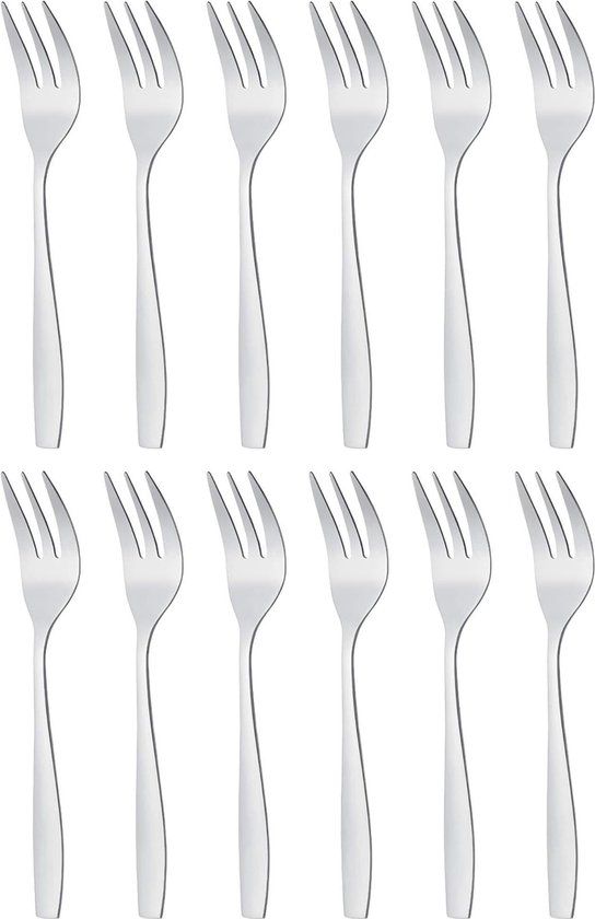 Dessertvorken in een set van 12 stuks. Lengte: 14 cm, handgreepdikte: ca. 1,4 mm. Gewicht per stuk: ca. 14 g. Van roestvrij staal 18/0 (chroomstaal), met de hand gepolijst, vaatwasmachinebestendig, roestvrij, nikkelvrij Met de 12-delige