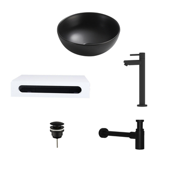Bekijk productZwarte Ronde Keramische Waskom met Planchet, Kraan, Afvoer en Sifon - 40x22x8 cm - Wandgemonteerde toiletten
