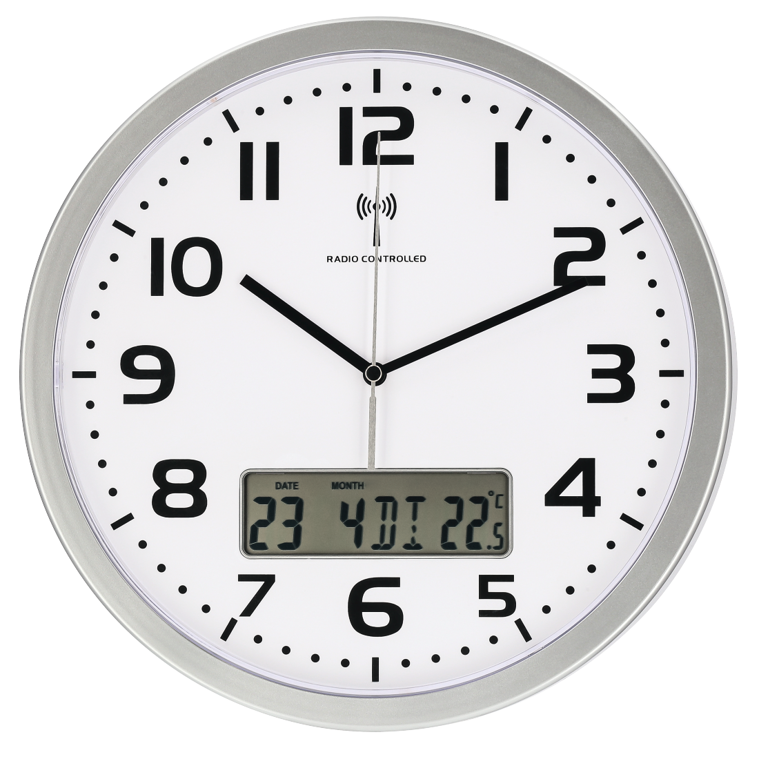 - DCF radio clock which automatically adjusts to the world's most accurate clock\n- The time zone can be set manually if the DCF time differs from that of the time zone\n- DCF radio signal can be switched off completely when not in use\n\n- Radio clock with analogue time display and digital calendar display and temperature display\n- Large, white dial with Arabic numerals and second hand\n- Summertime display\n- 7 languages to choose from (DE, FR, IT, ES, NL, DA, EN)\n- Radio can be switched on and off manually\n- Can be switched between °C and Fahrenheit