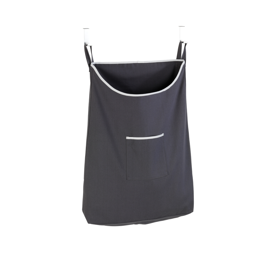 Practical and space-saving laundry bag made of hardwearing material. With two hooks for hanging into the rabbet (2 and 4 cm). The zipper at the bottom enables an easy removal of the laundry.\n\n- Space-saving laundry collector in trendy grey\n- Simply hook onto the door with stainless steel hooks\n- With a practical zip for easy removal\n- Made of high-quality cotton, capacity: 65 litres