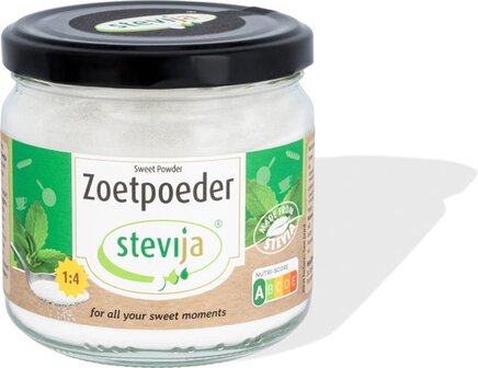 Stevia Zoetpoeder is steviolglycosiden* (*extract uit de stevia plant) verrijkt met inuline, een makkelijk oplosbare vezel die van nature voorkomt in cichorei, agave, fruit en groenten. Dankzij de toevoeging van inuline is dit zoetpoeder een perfect alternatief voor poedersuiker, met maar liefst 90% vezels. Deze vezels dragen bij aan een gezonde darmflora. Bovendien is Stevia Zoetpoeder eenvoudig te doseren: één kwart theelepel staat gelijk aan één theelepel suiker. Tijdens het bakken komt de zoete kracht van stevia in Stevia Zoetpoeder nog beter tot uiting, waardoor je er zuinig mee kunt omgaan. Een potje Stevia Zoetpoeder is voldoende voor het bakken van zo'n 10 cakes.
