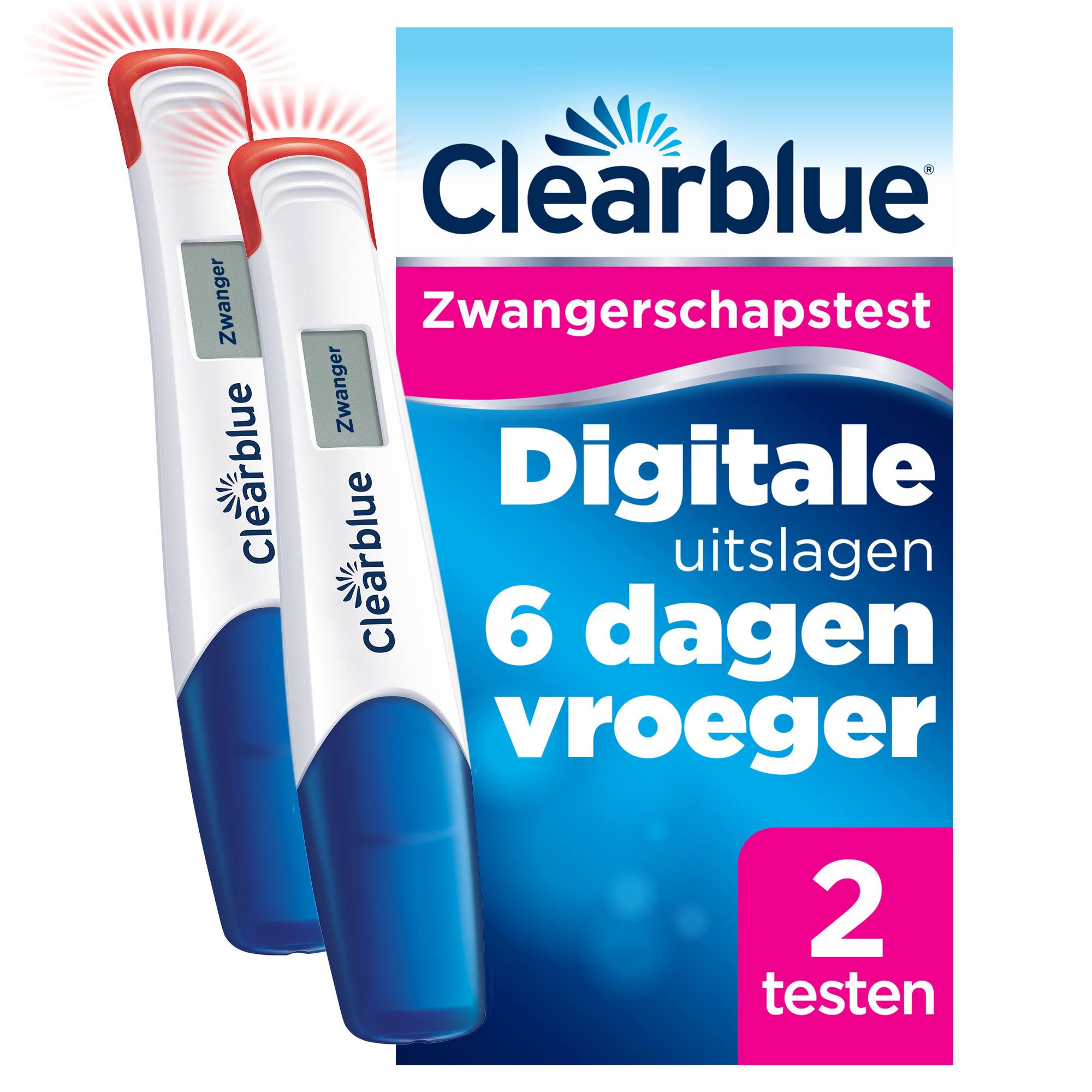 Clearblue Zwangerschapstest Ultravroeg is de meest gevoelige zwangerschapstest. Er is geen test waarmee u sneller een uitslag krijgt. Uitslag vanaf 6 dagen voor uw gemiste menstruatie. Bovendien is Clearblue het nauwkeurigst: meer dan 99% nauwkeurig vanaf de dag waarop uw menstruatie zou moeten beginnen.Hoe te gebruiken? Houd het van kleur veranderende uiteinde gedurende 5 seconden in uw urinestraal. Wacht 3 minuten voordat u uw resultaten afleest. Duidelijke en eenvoudige uitslag.