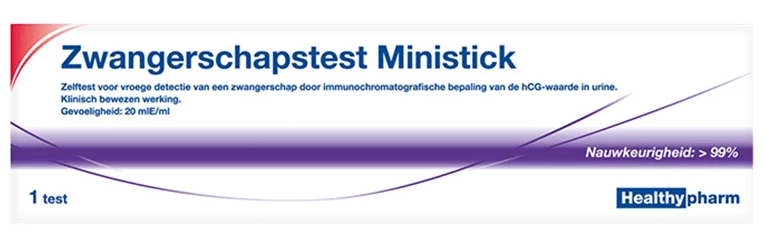 Healthy Zwangerschapstest Mini is een zelftest door vroege detectie van een zwangerschap door immunochromatografische bepalingen van de hcg waarde in urine. De zwangerschapstest is meer dan 99% betrouwbaar vanaf de dag waarop de menstruatie had moeten beginnen.Healthy Zwangerschapstest Mini:Klinisch bewezen99 % betrouwbaarHoe te gebruiken?Open het zakje en haal de zwangerschapstest eruit. Verwijder de beschermdop. Houd het absorberende uiteinde, aangegeven met een pijl 10 seconden in de urinestraal tot het uiteinde doorweekt is. Doe de dop er weer op. Leg de test neer of houd hem horizontaal tijdens het wachten. Lees het resultaat af na 3 tot maximaal 5 minuten.