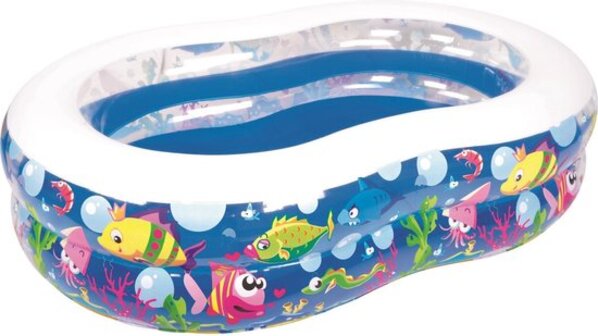 8 vormig familiezwembad met print van zeedieren. Met gemakkelijke leegloopplug en reparatiesetje. Van 0,28 mm vinyl. Watercapaciteit (75%): 312 liter. Leeftijd: 6+ jr. Afmeting: 175 x 109 x 46 cm.