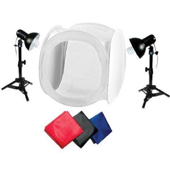 StudioKing Product Photo Kit WTK75\nWith this set you can create beautiful product photos for using them in a webshop. The white cloth distributes the light evenly and this reduces shade. This causes no reflections in objects that usually cause reflections such as glass.\n\nThe 40W daylight lamps don't become hot and have a high light yield (40W energy efficient bulbs = 200W normal light). For more power you can choose for optional daylight lamps with 55, 70 and 85W power (see "Optional Accessories"). The set comes in a full color box. Background cloths in four colors are included. With these variety you have always the right background cloth for every situation.\n\nIncluded:\n1 x Light tent 75 x 75 x 75 cm\n2 x Daylight lamp 40W\n2 x Light stand (max 40 cm)\n4 x Background cloth (white, black, red, blue)