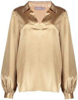 Geisha blouse satijn 53530-14. Kleur sand. Deze blouse heeft een soepelvallende pasvorm die een vloeiende, vrouwelijke uitstraling biedt. De kraag met diepere V-hals voegt een verfijnde touch toe. De lange mouwen met manchetten en knoopjes zorgen voor een nette en elegante afwerking.
