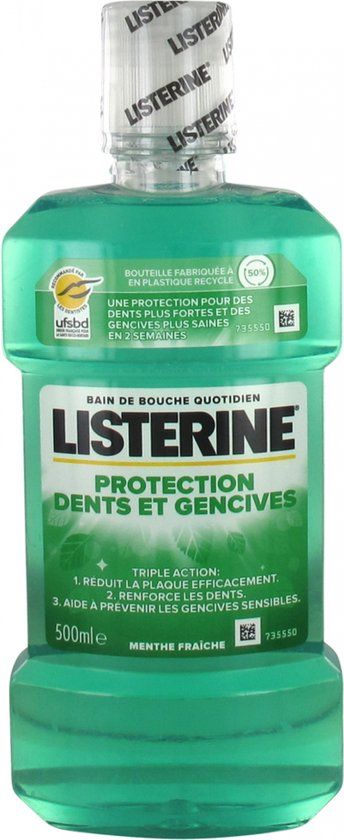 Listerine Mondwater Tand- en Tandvleesbescherming Verse Munt 500 ml is een drievoudig werkend dagelijks mondwater dat bescherming biedt voor gezondere tanden en tandvlees en een gevoel van reinheid dat 3 keer langer aanhoudt dan poetsen alleen: Het versterkt de tanden en beschermt ze tegen gaatjes.Het vermindert tandplak om het tandvlees gezond te houden en werkt zelfs onder de tandvleesrand.Helpt gevoelig tandvlees voorkomen.Klinisch getest. Bevat natriumfluoride (300 ppm F). Frisse muntgeur.