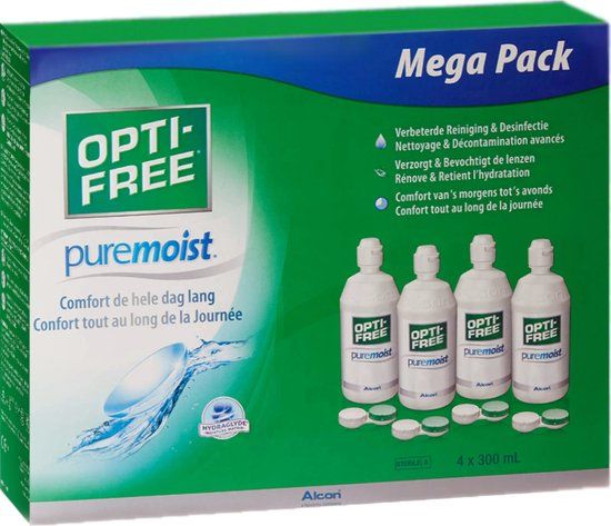 Als je lenzen draagt, wil je dat deze comfortabel blijven aanvoelen, vanaf het moment dat je ze aanbrengt tot het uitnemen van de lenzen. De OPTI-FREE® PureMoist® lenzenvloeistof bevochtigt de lenzen tot wel 16 uur. Dit is mogelijk dankzij de unieke HydraGlyde® Moisture Matrix technologie. Daarnaast desinfecteert de OPTI-FREE® PureMoist® contactlenzen vloeistof de lenzen grondig en zorgt ervoor dat deze eiwit- en vetvrij zijn. De OPTI-FREE® PureMoist® lenzenvloeistof is geschikt voor alle soorten silicone hydrogel lenzen en je kunt je lenzen er ook in bewaren. Bespaar met deze voordelige Megapack!