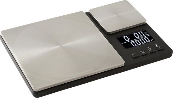 Ontdek de mogelijkheden Breng je creatieve kookkunsten naar een hoger niveau met de keukenaccessoires en gadgets van KitchenAid. Pizzawielen, spatels, ijslepels en nog veel meer. Onze producten hebben stoere designs om je creativiteit te prikkelen en je ideeën de vrije loop te laten. Deze weegschaal heeft een weegcapaciteit van 5000 gram x 1 gram voor platform 1 en 2500 gram x 1 gram voor platform 2, en beschikt over een LCD-uitlezing met 2 regels en achtergrondverlichting berekent nauwkeurige gewichten voor beide platforms tegelijkertijd, zodat je meerdere ingrediënten kunt meten. Weeg alle ingrediënten in één container door de tarrafunctie te gebruiken om het gewicht tussen de toevoegingen op nul te zetten. Werkt ook om het gewicht van elke container op nul te zetten . De duurzame roestvrijstalen oppervlakken vegen snel af. Alleen handwas. Niet onderdompelen in water of in de vaatwasser doen. Voor de beste resultaten, veeg af met een vochtige doek en droog grondig af. Bevat: - KitchenAid Keukenweegschaal Met Dubbel Platform - Dimensies (H x B x D): 3,18 x 21,34 x 30,23 centimeter, Gewicht: 54,43 gram - Zwart