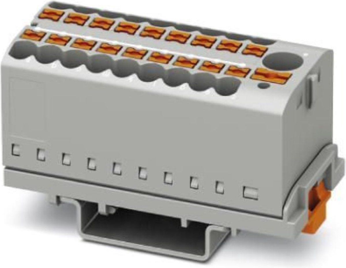 Verdelerblok, Blok met verticale uitlijning en geïntegreerde voeding, De blokken kunnen via de aderschacht onderling worden doorverbonden. Passende insteekbruggen zie Toebehoren, nominale spanning: 690 V, nominale stroom: 24 A, aansluitmethode: Push-in-aansluiting, Push-in-aansluiting, aantal aansluitingen: 19, doorsnede: 0,14 mm² - 4 mm², AWG: 26 - 12, breedte: 28,6 mm, kleur: grijs, montagetechniek: NS 35/7,5, NS 35/15