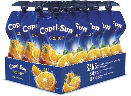 Capri-Sun Orange is een heerlijke dorstlesser met de smaak van sinaasappelsap. Het gaat niet om puur sinaasappelsap, maar sinaasappelsap met bronwater. Hierdoor is het beter in staat om de dorst te lessen. Naast sinaasappelsap bevat het ook een beetje citroen- en limoensap. Het geheel is met suiker en zoetstoffen gezoet, terwijl het geen kunstmatige smaakstoffen, kunstmatige kleurstoffen en conserveermiddelen bevat. Dankzij de unieke pouchverpakking is het extra gemakkelijk om het mee te nemen naar school of naar het werk.