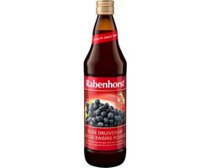 Rabenhorst Druivensap & IJzer is een 100% puur vruchtensap van rode druiven en is verrijkt met ijzer afkomstig van currybladeren. De rode druiven worden door Rabenhorst op zorgvuldige wijze tot sap verwerkt waardoor de puurheid van de ingrediënten behouden blijft. Dit vruchtensap is niet alleen heerlijk puur van smaak, maar is ook nog eens rijk aan ijzer. IJzer speelt een rol in de normale vorming van rode bloedcellen en hemoglobine en draagt bij aan het normale zuurstoftransport in het lichaam. Trakteer uzelf op een gezonde en voedzame drank! Hoe te gebruiken? De fles goed schudden voor gebruik. Een hoeveelheid van 125ml dekt de dagelijkse referentie-inname van ijzer voor 31%.