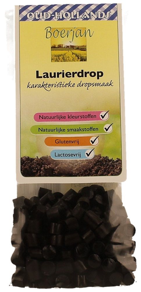 Boerjan Laurierdrop is een oud-Hollandse lekkernij met karakteristieke dropsmaak. Deze laurierdrop is vrij van gluten en lactose en is enkel gemaakt op basis van natuurlijke kleur- en smaakstoffen. WaarschuwingenMensen met een hoge bloeddruk dienen overmatig gebruik te vermijden.