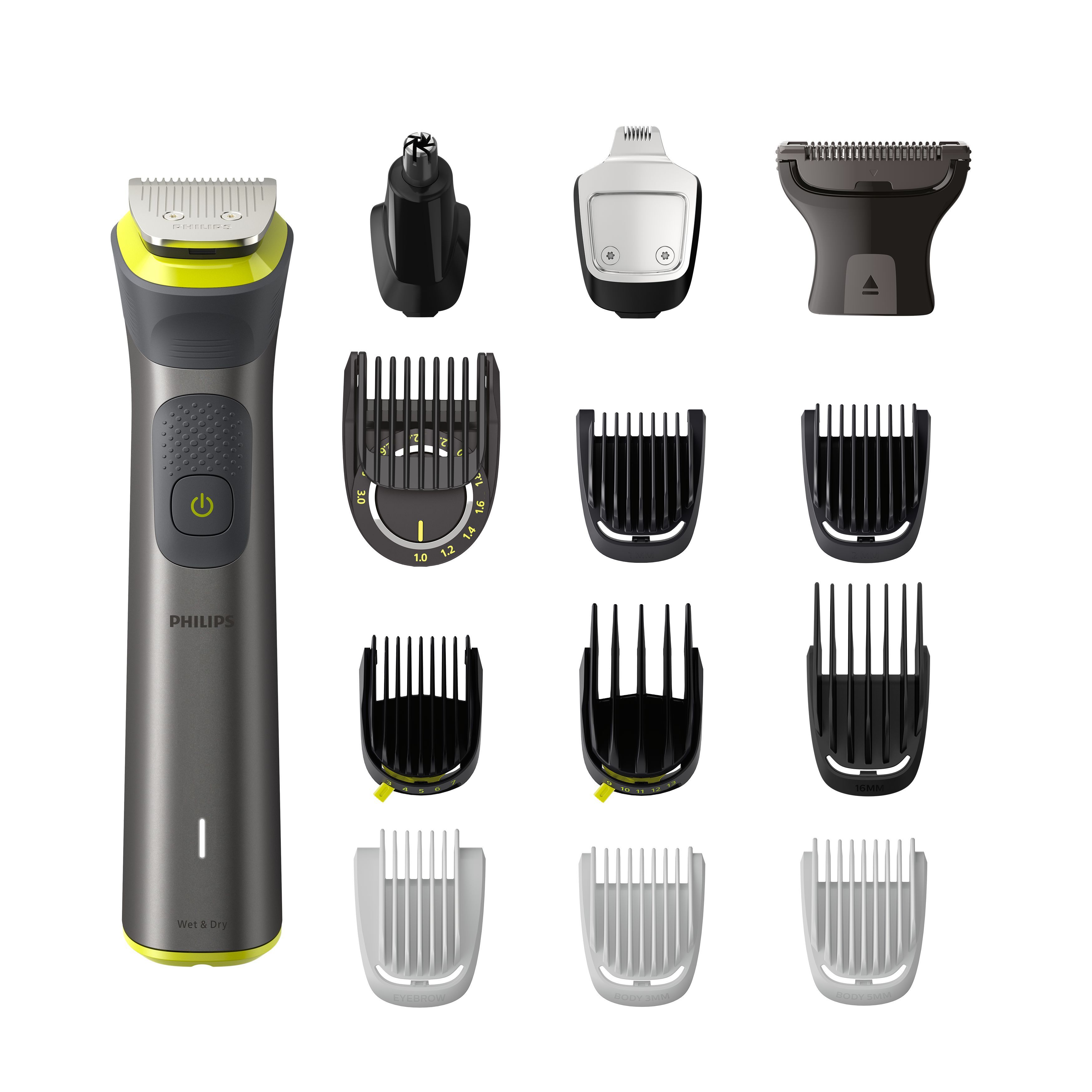 Maak uw persoonlijke look met deze veelzijdige trimmer, met 14 hulpstukken van hoge kwaliteit voor het stylen van uw gezicht, hoofd, en lichaam. De precisietrimkam levert een gelijke trim op de exacte lengte die u wilt.